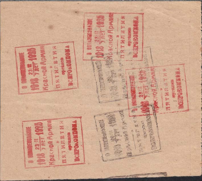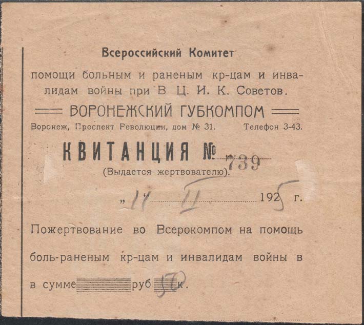 1925 г. 11.02.1925 г. Листок из квитанционной книжки разм. 121 х 105 мм. Одноцветная печать на сероватой бумаге. Левосторонняя нерегулярная зубц. В центре текст в одиннадцать строк: «Всероссийский Комитет помощи больным и раненым кр[асноармей]-цам и инвалидам войны при В.Ц.И.К. Советов. Воронежский Губкомпом Воронеж, Проспект Революции, дом № 31. Телефон 3-34. Квитанция № ... (Выдается жертвователю). «...»...192... г. Пожертвование во Всерокомпом на помощь боль[ным]-раненым кр[асноармей]-цам и инвалидам войны в сумме ... руб ... к. Слева вертикальная линия. На оборотной стороне каучуковым штампом нанесены юбилейные надпечатки ВСЕРОКОМПОМа.