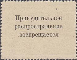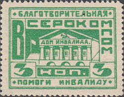 1925(?) г. Разм. рамки 36 х 27,5 мм. Двухцветная двухсторонняя печать на белой (оттенки) бумаге. Зубц. 11 1/2 низкого качества. С клеем. В прямоугольной рамке в центре изображение здания с текстом на фасаде: «Дом инвалида». По внутреннему периметру рамки текст: «Благотворительная. ВСЕРОКОМПОМ ... коп. ... Помоги инвалиду». На оборотной стороне текст в три строки: «Принудительное распространение воспрещается».