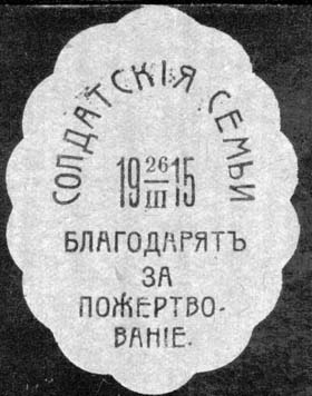 1915 г. 26.03.1915 г. Виньетка овальной формы разм. ≈ 44 х 58 мм с волнистыми краями. Одноцветная печать на бу-маге различных цветов с лаковым покрытием на лицевой стороне. В центре дата: «26/III 1915». Сверху полукругом текст: «Солдатские семьи». Внизу продолжение текста в четыре строки: «Благодарят за пожертвование».