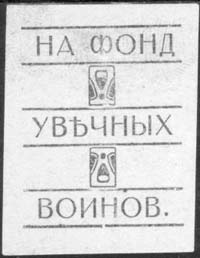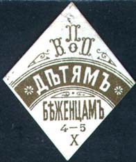 1915(?) г. Разм. 52 х 62 мм. Одноцветная печать на сероватой бумаге. В двойной декоративной рамке разм. ≈ 40,5 х 44,5 мм с растительным орна-ментом текст в три строки: «В пользу беженцев».
