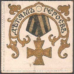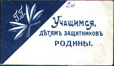 1916(?) г. Разм. 65 х 37 мм. Одноцветная печать на белой бумаге. Слева на сплошном фоне кокарда гимназиста и аббревиатура «Г.Г.». Справа текст в три строки: «Учащимся, детям защитников Родины».