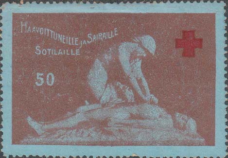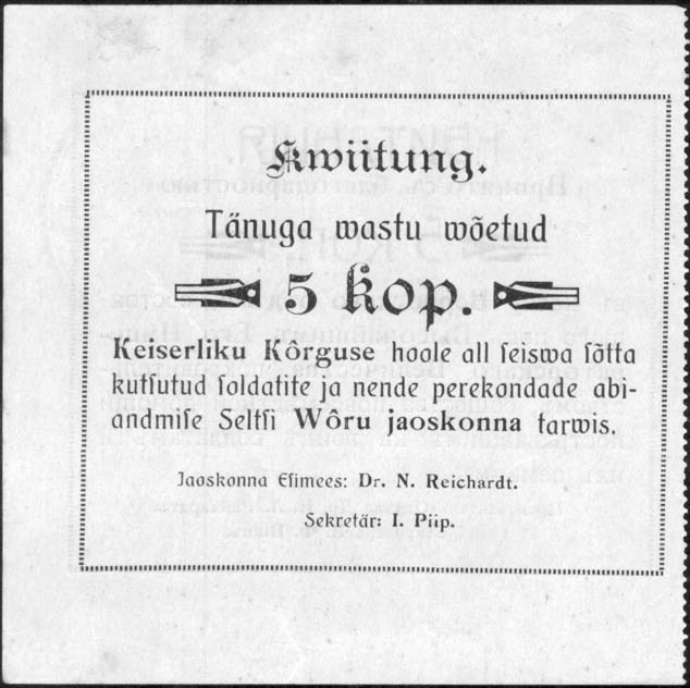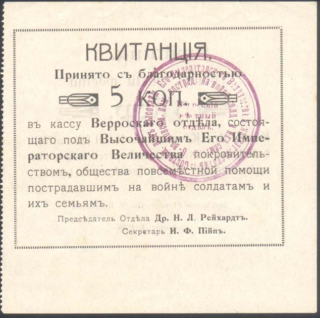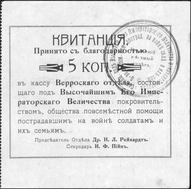 1914(?) г. Листок из квитанционной книжки. Одноцветная двухсторонняя печать на тонкой белой бумаге. Левосторонняя зубц. 11 1/2. На лицевой стороне в прямоугольной рамке разм. 90 х 74 мм в центре текст в девять строк: «Квитанция. Принято с благодарностью ... коп. в кассу Верроского отдела, состоящего под Его Императорского Величества покровительством, общества повсеместной помощи пострадавшим на войне солдатам и их семьям. Председатель Отдела Др. Н.Л.Рейхардт. Секретарь И.Ф.Пийп.». На оборотной стороне тот же текст на эстонском языке. На лицевой стороне лиловый оттиск круглой контрольной печати отдела.