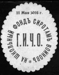 1916 г. 11.05.1916 г. Виньетка в форме овала разм. 34 х 42 мм с фигурными краями. Одноцветная печать на толстой белой бумаге. В центре аббревиатура «Г.И.Ч.О.». По окружности текст: «На школьный фонд сиротам воинов». Сверху дата: «11 мая 1916 г.».