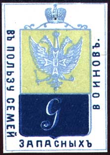 1915 г. 23.04.1915 г. Разм. рамки 34 х 50 мм. Трехцветная печать на толстой белой бумаге. В прямоугольной рамке в центре герб г. Гатчины. По периметру текст: «В пользу семей запасных воинов».