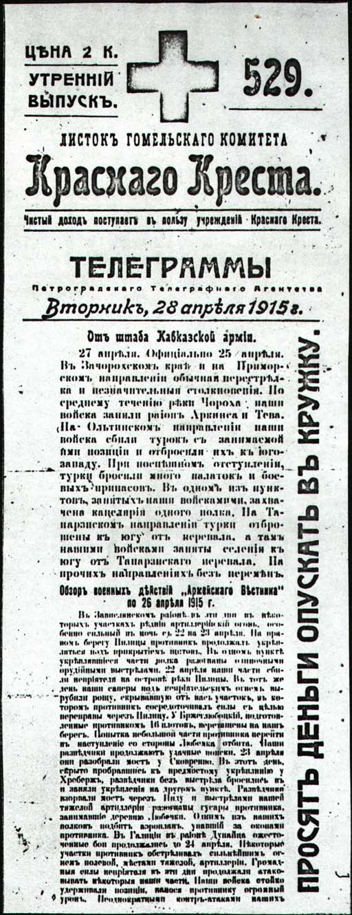 1915 г. 28.04.1915 г. Листок разм. 179 х 444 мм. Двухцветная двухсторонняя печать на тонкой сероватой бумаге. На лицевой стороне текст в девять строк: «Цена 2 к. Утренний выпуск. 529. Листок Гомельского Комитета Красного Креста. ТЕЛЕГРАММЫ Петроградского Телеграфного Агентства. Вторник, 28 апреля 1915 г.». Далее текст сообщения на обеих сторонах листка. Справа снизу верх крупным шрифтом текст: «Просят деньги опускать в кружку».