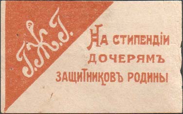 1916(?) г. Разм. 40 х 60 мм. Одноцветная печать на белой бумаге. В левом верхнем углу на сплошном фоне аббревиатура «Г.Ж.Г.». Справа текст в три строки: «На стипендии дочерям защитников родины».