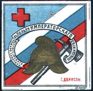 1915(?) г. Разм. рамки 46 х 45 мм. Многоцветная печать на белой бумаге. В двойной прямоугольной рамке в центре на фоне диагональной ленты цветов российского флага каска пожарного и топорик. По окружности на ленте текст: «В пользу Императорского Всероссийского Пожарн[ого]. Санитарн[ого]. Поезда №63». В левом верхнем углу красный крест. В левом нижнем углу текст: «г. Двинск». Под рамкой слева внизу выходные данные мелким латинским шрифтом: «Lit. Record».