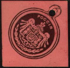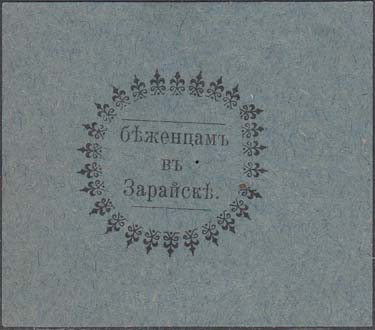 1915(?) г. Разм. 63 х 55 мм. Одноцветная печать на серо-синей волокнистой бумаге. В круглой в декора-тивной рамаке в центре текст в три строки: «Беженцам в Зарайске».