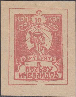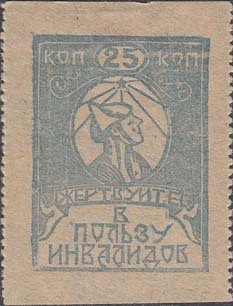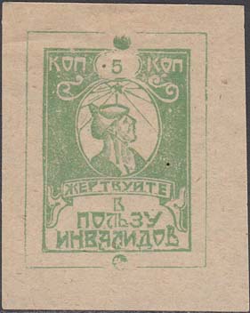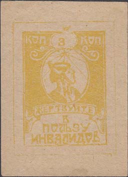 1924 г. Разм. 45 х 58 мм. Одноцветная печать на желтовато-серой бумаге. Б.З и вертикальная зубц. 11 1/2. В двойной прямоугольной рамке разм. 35 х 45 мм в центре в овале изображение красноармейца в профиль. Сверху номинал. Внизу текст в четыре строки: «Жертвуйте в пользу инвалидов».