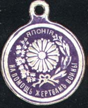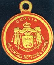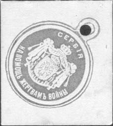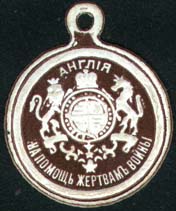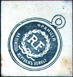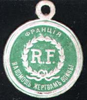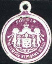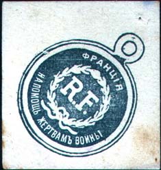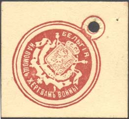 1915(?) г. Виньетка в форме круглой медали с ушком диаметром 29 мм. Одноцветная и двухцветная двухсторонняя печать с тиснением на белой бумаге. На лицевой стороне в центре гербы стран-союзниц России в Первой мировой войне. Сверху название страны. Обратная сторона покрыта серебряной или бронзовой краской. Внизу под гербом полукругом текст: «На помощь жертвам войны».