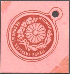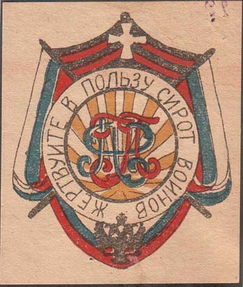 1916 г. 03.-04.09.1916 г. Разм. 57 х 63 мм. Многоцветная печать на желтоватой бумаге. В центре на фоне российских флагов в двойной круглой рамке монограмма из букв «О», «П» и «П». Сверху Георгиевский крест на ленте, внизу герб России. По периметру между круглыми рамками текст: «Жертвуйте в пользу сирот воинов».