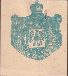 1915 г. Март 1915 г. Разм. ≈ 45 х 53 мм. Одноцветная печать на кремовой бумаге. В центре стилизованное изображение гербов России и Польши.