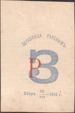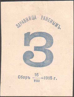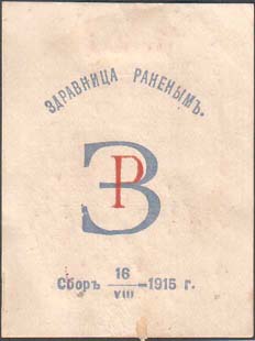 1915 г. 16.08.1915 г. Разм. 44 х 55 мм. Одноцветная и двухцветная печать на плотной белой бумаге. В центре крупные буквы «З» и «Р». Сверху полукругом текст: «Здравница раненым». Внизу текст: «Сбор 16/VII 1915 г.».