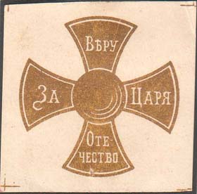 1915 г. 10.10.1915 г. Разм. 47 х 47 мм. Одноцветная печать на кремовой бумаге. В центре крест ополченца. По углам знака разделительные линии.