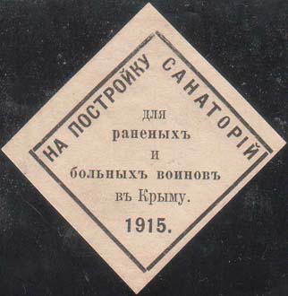 1915 г. Всероссийский сбор. Ромб разм. 55 х 55 мм. Одноцветная печать на белой бумаге. В рамке в форме ромба разм. 46 х 46 мм сверху текст по внутреннему периметру рамки: «На постройке санаторий». В центре продолжение текста в пять строк: «Для раненых и больных воинов в Крыму». Внизу дата: «1915».