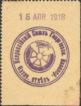 1918 г. 15.04.1918 г. Разм. ≈ 45 х 59 мм. Зубц. 10. Одноцветная печать на бумаге различных цветов. В центре круглая фиолетовая печать Казанского отдела Всероссийского Союза Георгиевских Кавалеров. В двойной круглой рамке диаметром 34 мм в центре в круге Георгиевский крест в венке. По окружности текст: «Казан[ский]. отдел. Всероссийский Союз Георгиевск[их]. Кавалер[ов].». Сверху ручным каучуковым штампом дата: «15 апр[еля]. 1918».