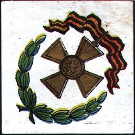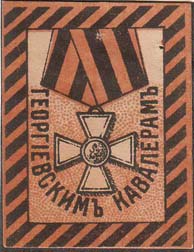 1914 г. Разм. 31 х 41 мм. Двухцветная печать на толстой желтоватой бумаге. В рамке из наклонных полосок цветов георгиевской ленты в центре Георгиевский крест. Внизу текст полукругом: «Георгиевским кавалерам».