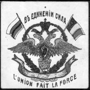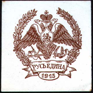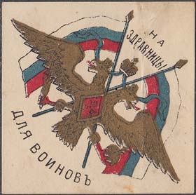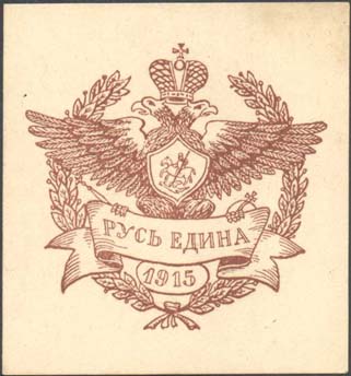 1915 г. Разм. 54 х 54 мм. Одноцветная печать на тол-стой белой бумаге. В центре в обрамлении венка двуглавый орел с царской короной и гербом Москвы на груди. Внизу на ленте текст: «Русь едина 1915».
