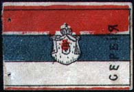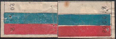 1916 г. 27-29.08.1916 г. Разм. 29 х 58 мм. Двухцветная печать на белой бумаге. Георгиевская лента, расположенная вертикально. В верхней части в круглой рамке Св. Георгий на коне, поражающий змея.