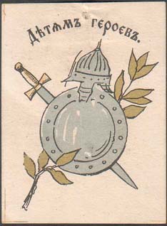 1916 г. 05.10.1916 г. Разм. 40 х 54 мм. Трехцветная печать на белой бумаге. В центре доспехи и лавровая ветвь. Сверху полукругом текст: «Детям героев».
