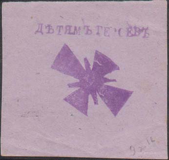 1916 г. 09.10.1916 г. Разм. 58 х 54 мм. Одноцветная печать на серо-синей бумаге. В центре фиолетовый оттиск ручного штампа в виде стилизованного георгиевского креста. Сверху оттиск ручного штампа с текстом: «Детям героев».