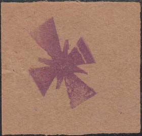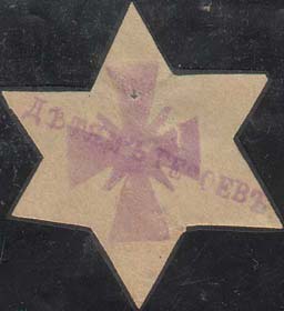 1915(?) г. Ромб разм. 41 х 51 мм. Одноцветная печать на толстой белой бумаге. В рамке в форме ромба в центре шестиконечная звезда. Сверху точка, обозначающее место для прокола булавкой.