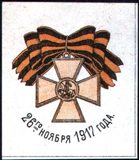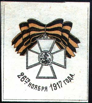 1917 г. 26.11.1917 г. Разм. 46 х 54 мм. Двухцветная печать на желтоватой бумаге. В центре Георгиевский крест на ленте. Внизу полукругом текст: «26-го ноября 1917 года».