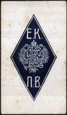 1915(?) г. Разм. 37 х 63 мм. Одноцветная печать на толстой белой бумаге. В центре ромб разм. 26 х 49 мм. В ромбе на сплошном фоне герб России и буквы аббревиатуры «Е.К.П.В.».