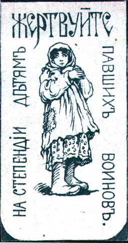 1916 г. 25.09.1916 г. Разм. 43 х 80 мм. Одноцветная печать на бумаге различных цветов. В центре девочка в зимней одежде. По периметру текст: «Жертвуйте на стипендии детям павших воинов».