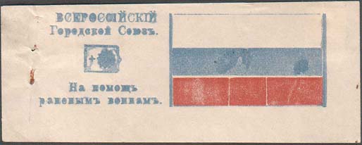 1915(?) г. Разм. 86 х 33 мм. Двухцветная печать на белой бумаге. Слева горизонтально герб г. Каменец-Подольский. Сверху слева текст в две строки: «Всероссийский Городской Союз». Внизу слева текст в две строки: «На помощь раненым воинам». Справа флаг России.