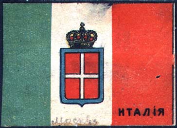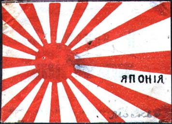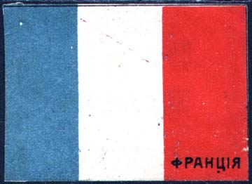 1915 г. 01.05.1915 г. Виньетки в виде флагов стран-союзниц России в Первой мировой войне. Разм. ≈ 58 х 42 мм. Двухцветная, трехцветная и многоцветная двухсторонняя печать на белой бумаге. На лицевой стороне в правом нижнем углу название страны. На оборотной стороне черный текст в две строки: «На помощь жертвам войны». Ниже текст в одну строку мелким шрифтом: «Москва, Маросейка, д.14. Тел. 60-64».