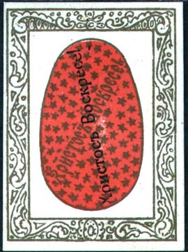 1914 г. 1915(?) г. Разм. рамки 40 х 56 мм. Трехцветная двухсторонняя печать на плотной белой бумаге. На лицевой стороне в декоративной рамке пасхальное яйцо. На яйце крест накрест две надписи: «Христос Воскресе!». На оборотной стороне текст в четыре строки: «На помощь жертвам войны. Москва, Маросейка, 14. Лебедеву, тел. 60-64. ».