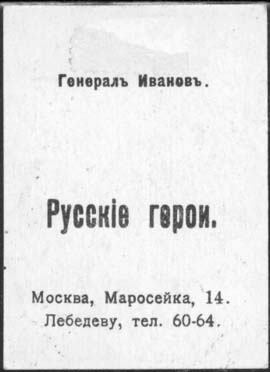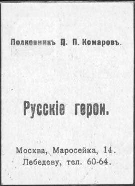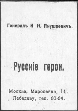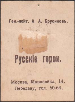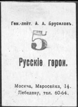 1914 г. 1915(?) г. Разм. рамки 40 х 56 мм. Двухцветная двухсторонняя печать на плотной белой бумаге. На лицевой стороне в двойной прямоугольной декоративной рамке портреты героев войны. На оборотной стороне звания и фамилии героев и текст: «Русские герои. Москва, Маросейка, 14. Лебедеву, тел. 60-64. ».