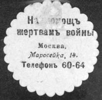 1914 г. 1915(?) г. Виньетка в виде круга диаметром 32 мм с фигурными краями. Одноцветная двухсторонняя печать на сероватой бумаге с мелованным верхним слоем. В центре знак Красного Креста. На оборотной стороне текст в пять строк: «На помощь жертвам войны. Москва, Маросейка, 14. Телефон 60-64».