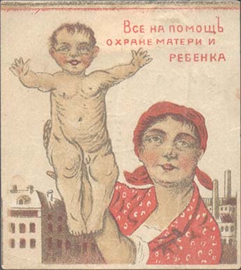 1925 г. Разм. рамки 37,5 х 39,5 мм.». Одноцветная печать на белой бумаге. В восьмиугольной рамке женщина с двумя детьми на фоне солнца и заводов. Внизу в прямоугольной рамке текст в две строки: «В помощь матери и ребенку». По периметру рамки на ленте текст: «Охрана материнства и младенчества». Внизу под рамкой выходные данные мелким шрифтом: «Окрлит №407. Тип. Изд. «Красное Знамя»».