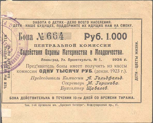 1924 г. Разм. 100 х 80 мм. Одноцветная печать на желтоватой бумаге. В двойной прямоугольной рамке разм. 92 х 55 мм текст в девять строк: «Бона №... (Номер нумератором) руб. 1000. Центральная комиссия Содействия Охраны Материнства и Младенчества. Ленинград, Ул. Пролеткульта, №1. 1924 г. Предъявитель боны имеет получить из кассы комиссии одну тысячу руб. (дензн. 1923 г.). Председатель Комиссии А.Гольдфельд. Секретарь М.Горинова. Бухгалтер Щавелев». По периметру рамки текст: «Забота о детях – дело всего населения. Дети – наше будущее, поддержите их, идущих нам на смену. Бона действительна в течении 10-ти дней со времени тиража». Чем мы будем крепче – тем вам будет легче. Дети – цветы жизни». Внизу под рамкой мелким шрифтом выходные данные: «Тип. 1–ой Артшколы им. «Красного октября». Международный пр., 17.». На лицевой стороне фиолетовый фрагмент оттиска круглой контроль-ной печати.