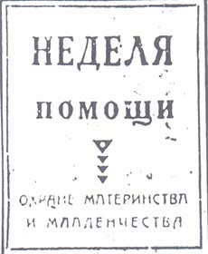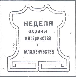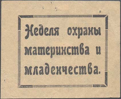 1925(?) г. Разм. 40 х 50 мм. Одноцветная печать на желтоватой бумаге. В центре в прямоугольной рамке орнамент из четырех треугольников, расположенных вертикально. Сверху текст в две строки: «Неделя помощи». Внизу продолжение текста в две строки: «Охране материнства и младенчества».