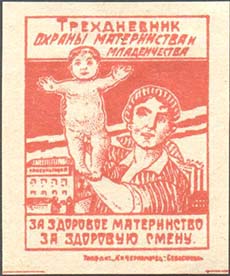 1925(?) г. Разм. 38 х 46 мм. Одноцветная печать на белой бумаге. В прямоугольной рамке разм. 31 х 39 мм женщина, держащая ребенка на руках. На заднем плане заводы. Сверху текст в три строки: «Трехдневник охраны материнства и младенчества». Внизу текст в три строки: «За здоровое материнство за здоровую смену». Внизу под рамкой мелким шрифтом выходные данные мелким шрифтом неразборчиво.