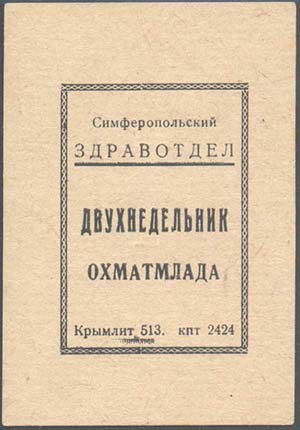 1930 г. Разм. 32 х 58 мм. Одноцветная печать на тол-стой желтоватой бумаге. В прямоугольной рамке разм. 31 х 44 мм в центре текст в две строки: «Двухнедельник Охматмлада». Сверху текст в две строки: «Симферопольский здравотдел». Внизу мелким шрифтом выходные данные: «Крымлит 513. кпт 2424».