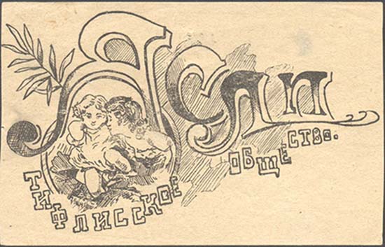 1915(?) г. Разм. 94 х 61 мм. Одноцветная печать на желтоватой бумаге. Двое детей и лавровая ветвь. Текст: «Ясли. Тифлисское общество».