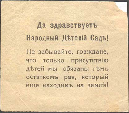 1917(?) г. Разм. 71 х 60 мм. Одноцветная печать на бумаге различных цветов. Сверху текст в две строки: «Да здравствует народный Детский Сад!». Ниже текст в пять строк: «Не забывайте, граждане, что только присутствию детей мы обязаны тем остатком рая, который еще находим на земле!».