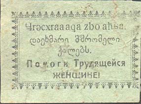 1930(?) г. Разм. 50 х 37 мм. Одноцветная печать на тонкой белой бумаге. В прямоугольной декоративной рамке разм. 45 х 27 мм в центре текст в две строки на грузинском языке. Сверху текст на грузинском языке латинской графикой. Внизу текст в две строки: «Помогите Трудящейся женщине!».