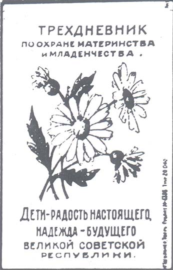 1927 г. 26.- 29.05.1927 г. Разм. 58 х 89 мм. Одноцветная печать на белой бумаге. В центре букет ромашек. Сверху текст в три строки: «Трехдневник по охране материнства и младенчества». Внизу текст в четыре строки: «Дети – радость настоящего, надежда будущего великой советской республики». Справа вертикально снизу вверх мелким шрифтом выходные данные: «Лит. Шульнер. Тверь Гублит №4356. Тир 20000».