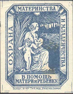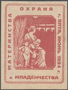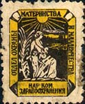1928(?) г. Разм. 21 х 26 мм. Двухцветная печать на белой бумаге. Зубц. 11 1/2. В центре в прямоугольной рамке из ленты со срезанными углами разм. 16 х 21 мм женщина с двумя детьми. По периметру на ленте текст: «Отдел охраны материнства и младенчества Нар[одного]. Ком[иссариата]. Здравоохранения.