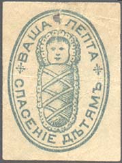 1917(?) г. Разм. 29 х 39 мм. Одноцветная печать на желто-ватой бумаге. В центре в двойной овальной рамке грудной ребенок в пеленках. По внутреннему периметру рамки текст: «Ваша лепта спасение детям».