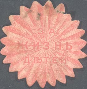 1917(?) г. Виньетка в виде стилизованного цветка хризантемы диаметром 49 мм. Одноцветная печать на белой бумаге. В центре цветка текст в три строки: «За жизнь детей».