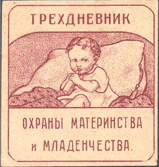 1924(?) г. Разм. 53 х 57 мм. Одноцветная печать на желтоватой бумаге. В центре в прямоугольной рамке с закругленными краями разм. 49 х 53 мм на кровати грудной ребенок с бутылкой молока. Текст: «Трехдневник охраны материнства и младенчества».
