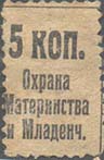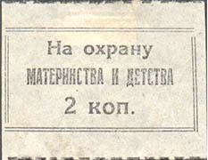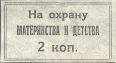 1924(?) г. Разм. 39 х 41 мм. Одноцветная печать на тонкой белой бумаге. Горизонтальная просечка. В центре в двойной прямоугольной рамке разм. 36,5 х 20 мм текст в две строки: «На охрану материнства и детства». Внизу номинал.