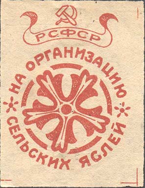 1924(?) г. Разм. 50 х 65 мм. Одноцветная печать на желто-серой бумаге. В центре орнамент в виде цветка. По окружности текст: «На организацию сельских яслей». Сверху серп и молот и лента, на которой аббревиатура «РСФСР».