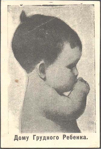 1924(?) г. Разм. 56 х 83 мм. Одноцветная печать на плотной белой бумаге. В центре изображение грудного ребенка. Внизу текст: «Дому грудного ребенка».